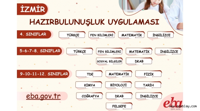 İzmir’de bulunan tüm resmi okullarda uygulanacak olan Hazırbulunuşluk Uygulaması; 4. sınıflarında Türkçe, Matematik, Fen Bilimleri ve İngilizce derslerinden 15'er soru; 5, 6 ve 7. sınıflarında Türkçe, Matematik, Fen Bilimleri, Sosyal Bilgiler, Din Kültürü ve Ahlak Bilgisi, İngilizce derslerinden 15'er soru; 8. Sınıflarında Türkçe, Matematik, Fen Bilimleri, T.C. İnkılap Tarihi ve Atatürkçülük, Din Kültürü ve Ahlak Bilgisi ve İngilizce derslerinden 15’er sorudan oluşuyor.  Liselerin 9 ve 10. sınıflarında Türk Dili ve Edebiyatı, Matematik, Fizik, Kimya, Biyoloji, Tarih, Coğrafya, Din Kültürü ve Ahlak Bilgisi ve İngilizce derslerinden 15'er soru, 11. sınıflarında Türk Dili ve Edebiyatı, Matematik, Fizik, Kimya, Biyoloji, Tarih, Coğrafya, Din Kültürü ve Ahlak Bilgisi, İngilizce ve Felsefe derslerinden 15'er soru, 12. sınıflarında Türk Dili ve Edebiyatı, Matematik (Temel Düzey, İleri Düzey), Fizik, Kimya, Biyoloji, Tarih, Coğrafya, Din Kültürü ve Ahlak Bilgisi ve İngilizce derslerinden 15'er sorudan oluşuyor.  Hazırbulunuşluk Uygulaması 08-09 Ekim 2022 tarihlerinde EBA platformu üzerinden gerçekleştirilecektir.