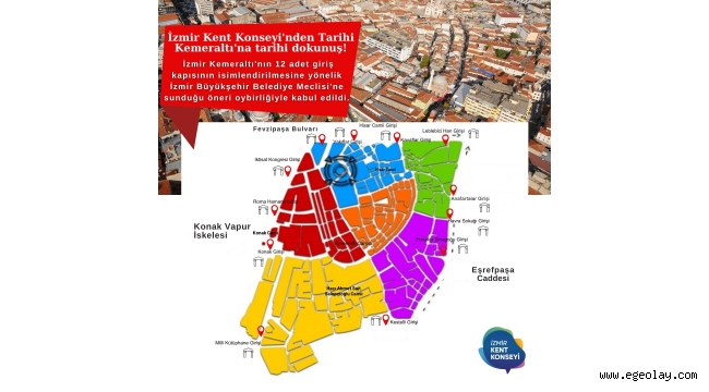 İzmir ile ilgili tümüyle gönüllü görev yapan bir üst yapı sivil toplum kuruluşu olan İzmir Kent Konseyi'nin önerisiyle Tarihi Kemeraltı'nın 12 girişinin isimlendirilmesi,kentin başta olmak üzere ulusal ve uluslararası turizmin hizmetine sunulmuş olacak.