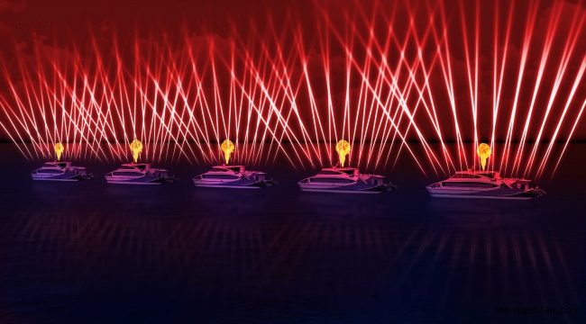 Saat 20.44’ten itibaren Cumhuriyet Meydanı açıklarındaki gemiler düdüklerini çalmaya başlayacak. Saat 20.45’te gemiden ilk sesli mayının atılmasıyla birlikte müzik sesi yükselecek ve görsel şovun startı verilecek. Cumhuriyet Meydanı, Karşıyaka, Bostanlı, Göztepe hattında hareket eden gemilerin gösterisi 21.30’a kadar sürecek.