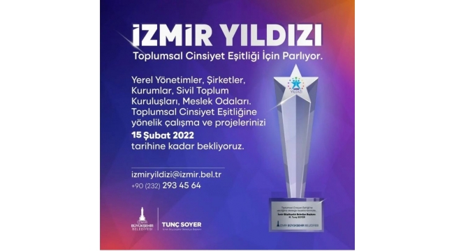 EGEOLAY/İzmir Büyükşehir Belediyesi kadına yönelik her türlü şiddet ve ayrımcılığın önlenmesine yönelik iyi uygulama örneklerine ödül verecek. “İzmir Yıldızı Ödülleri”ne yerel yönetimler, şirketler, kurumlar, sivil toplum kuruşları, meslek odaları ve gerçek kişiler toplumsal cinsiyet eşitliğine yönelik projeleriyle katılabilecek. Projelerin son teslim tarihi 15 Şubat.