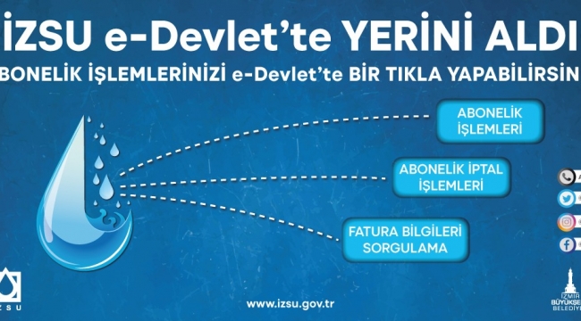 İzmirliler su aboneliği işlemlerini artık e-Devlet platformu üzerinden de yapabiliyor. Hayata geçirilen proje ile işlem yapmak için İZSU şubelerine gidilmesine gerek kalmadı. Sistem, işlemlerini dijital ortamda gerçekleştirmek isteyenlere kolaylık sağlıyor.
