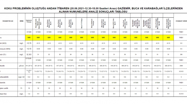 Sorunun yaşandığı saatler içinde çeşitli noktalardan su numuneleri alınmış, kurumumuzun akredite laboratuvarlarında testler yapılmış ve insan sağlığına zarar verecek herhangi bir bulguya rastlanmamıştır. Söz konusu test sonuçlarının bulunduğu tablo ekte yer almaktadır.