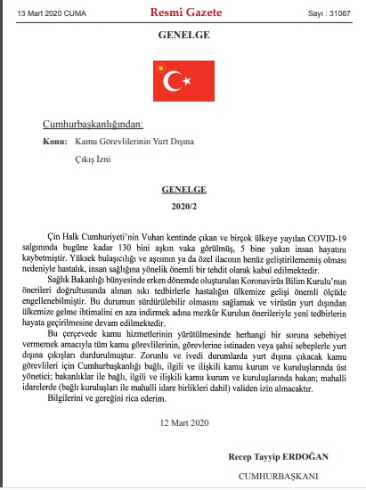 EGEOLAY/Cumhurbaşkanı genelgesi resmi gazetede yayımlandı. Kamu görevlilerinin görev veya şahsi sebeplerle yurtdışına çıkışı durduruldu.