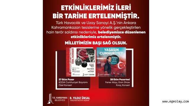 EGEOLAY/Karşıyaka Belediyesi, Ankara’da meydana gelen hain terör saldırısı nedeniyle, Cumhuriyet Bayramı kutlamaları kapsamındaki eğlence programı ve törenleri erteleme kararı aldı. ‘KODA Cumhuriyet Bayramı Özel Konseri’, ‘Fener Alayı’, ‘Kıraç Konseri’ ve ‘Zübeyde Hanım’ın Mutfağı Sergisi’ açılış töreninin ileri tarihlerde gerçekleştirileceği açıklandı.