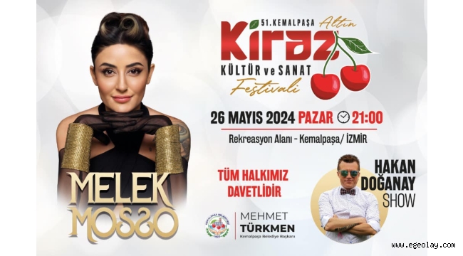 Kemalpaşa Altın Kiraz Kültür ve Sanat Festivali’nin 51’incisi, 26 Mayıs Pazar günü saat 20.00’de gerçekleştirilecek açılış konuşmaları ile başlayacak. Festival kapsamında düzenlenecek olan Kiraz Teşvik Müsabakası ile yılın en kaliteli kirazlarının belirleneceği etkinlikte, Hakan Doğanay sahne şovları ve sunumuyla festivale renk katacak. Kemalpaşalı kiraz üreticilerinin ödüllerini Başkan Mehmet Türkmen’den alacağı etkinlikte Melek Mosso gecenin finalinde şarkılarıyla unutulmaz bir gece yaşatacak.