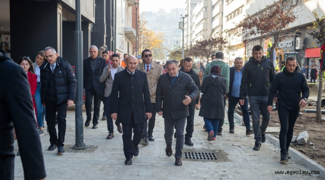 EGEOLAY/İzmir Büyükşehir Belediye Başkanı Tunç Soyer, altyapı çalışmalarının ardından üstyapı çalışmalarında da sona yaklaşılan Kemeraltı’nın Milli Kütüphane ve Anafartalar caddelerini inceledi. Parke döşemesinden kent mobilyasına, aydınlatmadan peyzaja yepyeni görünüme kavuşacak caddelerdeki çalışmalar 29 Aralık Cuma günü tamamlanıyor.