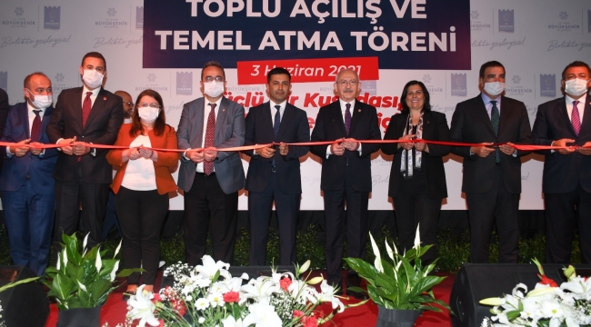 Toplu açılış ve temel atma töreninde, konuşmaların ardından CHP Genel Başkanı Kemal Kılıçdaroğlu, CHP Genel Başkan Yardımcıları Gülizar Biçer Karaca ve Ahmet Akın, CHP Parti Meclisi Üyesi ve İstanbul Milletvekili Erdoğan Toprak, CHP Parti Meclisi Üyesi ve Aydın Milletvekili Bülent Tezcan, CHP Aydın Milletvekilleri Süleyman Bülbül, Hüseyin Yıldız, CHP Aydın İl Başkanı Ali Çankır, Aydın Büyükşehir Belediye Başkanı Özlem Çerçioğlu, CHP Kuşadası İlçe Başkanı Mehmet Gürbilek ve Kuşadası Belediye Başkanı Ömer Günel tarafından açılışı yapılan yerler için kurdele kesilirken, temeli atılan yerler içinse butona basıldı.