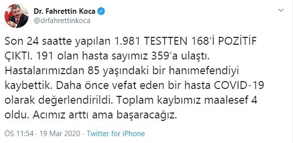 Son 24 saatte yapılan 1.981 TESTTEN 168’İ POZİTİF ÇIKTI. 191 olan hasta sayımız 359’a ulaştı. Hastalarımızdan 85 yaşındaki bir hanımefendiyi kaybettik. Daha önce vefat eden bir hasta COVID-19 olarak değerlendirildi. Toplam kaybımız maalesef 4 oldu. Acımız arttı ama başaracağız.