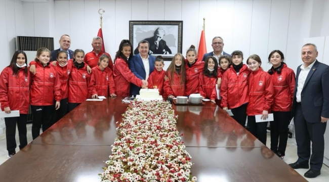 Konak Belediyespor’un altyapı takımlarından U-13 Kız Futbol Takımı, İzmir Şampiyonu oldu. Türkiye Büyük Millet Meclisi (TBMM), Gençlik ve Spor Bakanlığı ile Milli Eğitim Bakanlığı (MEB) ortaklığıyla düzenlenen “Mahallede Maç Var” 23 Nisan Futbol Turnuvası kapsamında mücadele eden takım, tüm rakiplerini mağlup ederek Türkiye Şampiyonası’nda İzmir’i temsil etmeye hak kazandı. Konak Belediye Başkanı Abdül Batur da Teknik Direktör Varol Karul, Spor Müdürü İsmail Karşı, Belediye Meclis üyesi Cumhur Ter ve Belediye Başkan Yardımcısı Asker Güneş ile birlikte takım oyuncularını makamında konuk ederek final sevinçlerine ortak oldu. Heyecan ve mutlulukları gözlerinden okunan genç sporcular Başkan Batur’la birlikte galibiyet pastası kesti. Başkan Batur, “Kız Futbol takımımız İzmir’i Süper Lig’de temsil ediyor. U-13 takımımız da ablalarının izinden giderek göğsümüzü kabartan başarılarla bize büyük gurur yaşatıyorlar. Hepsini ayrı ayrı kutluyorum. Hepsi pırıl pırıl, hepsi çok yetenekli. Türkiye finalinde de galip gelerek şampiyon olacaklarına yürekten inanıyorum. Şampiyon takımımıza güvenimiz tam” diye konuştu.