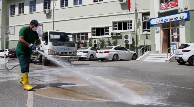 Halk sağlığı konusunda gerekli hassasiyete sahip olan ve korunması noktasında tüm imkanlarını sonuna kadar kullanan Konak Belediyesi, haftasonu yapılacak LGS Sınavlarının yapılacağı okullar ile yüz yüze eğitimin başladığı eğitim kurumlarında kapsamlı bir dezenfeksiyon çalışması gerçekleştirdi. Konak Belediyesi Temizlik İşleri Müdürlüğüne bağlı dezenfeksiyon ekipleri, öncelikle okul bahçelerinde köpüklü yıkama yaptıktan hemen sonra okul girişi, idari odalar, sınıflar, tuvaletler gibi alanları dezenfekte ettiler. Yoğun temasın yaşandığı kapı kolları, trabzanlar ve muslukların dezenfeksiyonunu hassasiyetle gerçekleştiren dezenfeksiyon ekipleri, 132 okulu güvenli hale getirdi. Okul öncesi, ilkokul, ortaokul ve lise öğrencileri, yüz yüze eğitime sağlıklı koşullarda başlarken, hafta sonu LGS Sınavlarına girecek olan öğrenciler de tamamen dezenfekte edilmiş, hijyenik koşullarda sınavda yerlerini alacaklar.