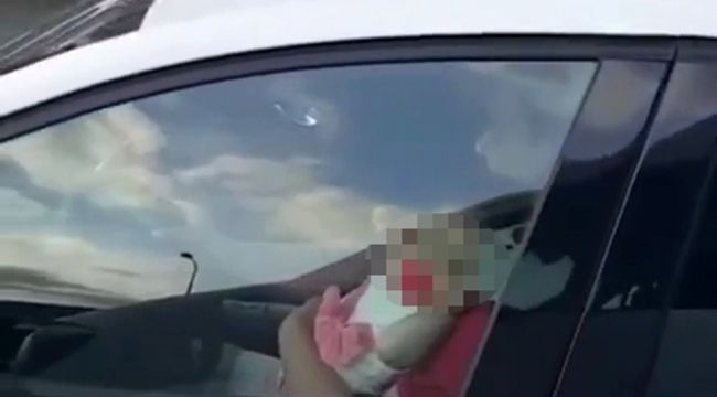 O anlar ise yolda ilerleyen başka bir vatandaş tarafından cep telefonu kamerasınca kaydedildi. Görüntülerde, kucağında bebek olan sürücü aracıyla yolda ilerliyor.