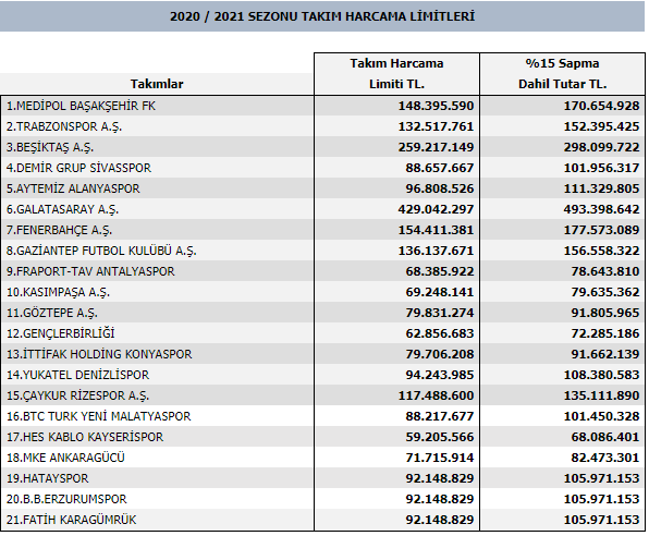 TFF'den yapılan açıklamaya göre, Kulüp Lisans ve Finansal Fair Play Talimatı'nın 89. Maddesi kapsamında belirlenen Süper Lig Takım Harcama Limitleri şöyle hesaplandı: