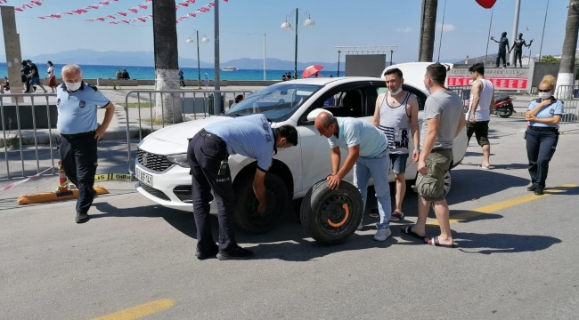 EGEOLAY/Kocaeli'nden Kuşadası'na otomobili ile tatil yapmak için gelen Semiha Kılıçarslan'ın kent merkezinde lastiği patladı. Patlayan lastiği değiştirmek için çevredekilerden yardım isteyen Kılıçaraslan'ın imdadına Kuşadası Belediyesi Zabıta Müdürlüğü ekipleri koştu.