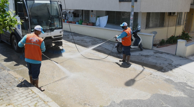 Türkiye’de ilk koronavirüs vakasının görüldüğü 11 Mart 2020 tarihinden itibaren toplum sağlığını korumak için gerekli tüm önlemleri alan Kuşadası Belediyesi, kent genelinde yürüttüğü temizlik ve hijyen çalışmalarını Ramazan Bayramı’nda da sürdürüyor. Tam kadro temizlik personeli ile sahaya inen TİM ekipleri tarafından, bayramı da kapsayan tam zamanlı kapanma döneminde uygulanan temizlik seferberliğinde basınçlı su kullanılarak cadde ve sokaklar köpükle yıkanıyor. Çevreye zarar vermeyen güçlendirilmiş bitkisel deterjanların kullanıldığı çalışmada virüsle mücadelenin en önemli silahı olan dezenfeksiyon işlemi de ihmal edilmiyor. Ekiplerce, vatandaşların temas etme ihtimali bulunan tüm yüzeyler, çocuk parklarının oyun grupları, banklar ve çöp kutuları özel solüsyonlarla ilaçlanıyor.