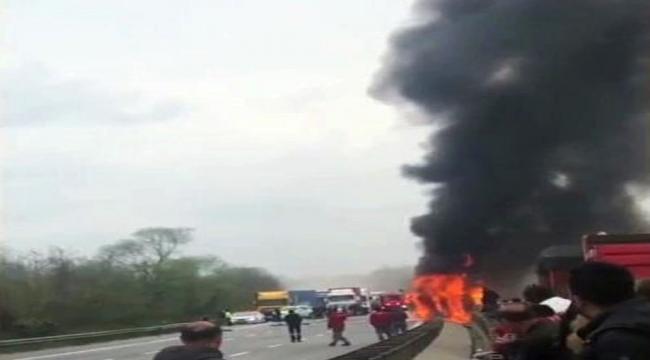 TEM otoyolunda lastiği patladıktan sonra devrilen tır alev alırken, taşıdığı yük karşı şeritten gelen tıra çarptı. Kazada 1 kişi yaralanırken, otoyolda kilometrelerce kuyruk oluştu.