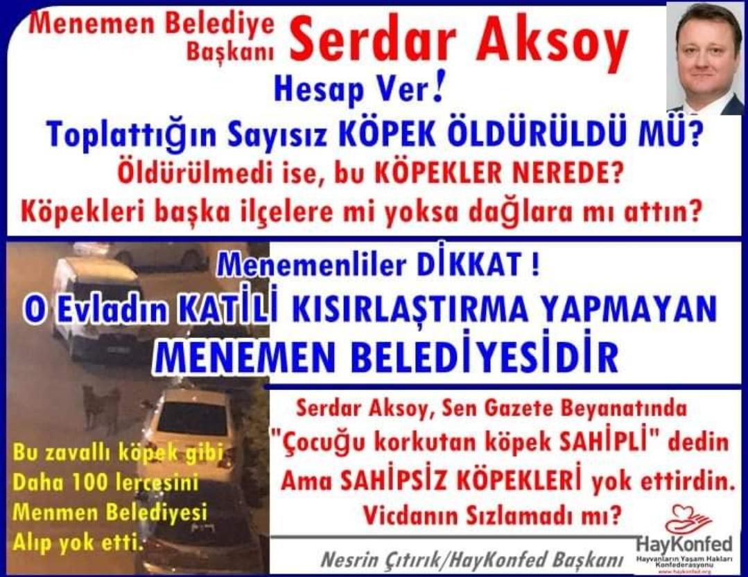 31 Mart 2019 Yerel Seçim sürecinde Menemen Belediye Başkanı Serdar Aksoy hem HAYTAP hem de HAYKONFED ile Hayvan Koruma Kanunu' nu uygulayacağına dair protokol yapmıştı. Sokak Hayvanlarına ilişkin protokol ihlaline tepki bu kez HAYKONFED 'ten geldi.