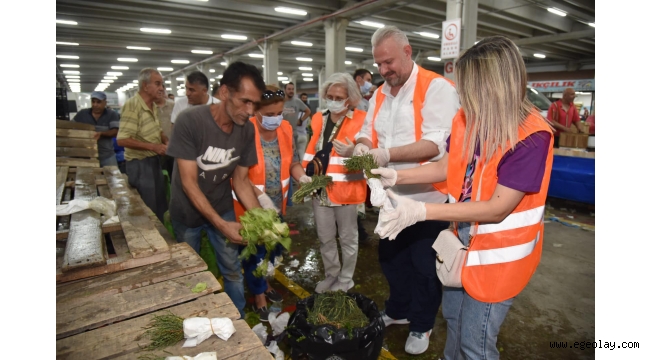 Verimli geçen seminerin ardından Baybara, kendisine eşlik eden Filiz Pehlivan, başkan yardımcıları, belediye personelleri ve diğer katılımcılarla birlikte Seyrek’te kurulan pazar yerine giderek, kompost haline dönüştürmek üzere sebze ve meyve atıklarını topladı.