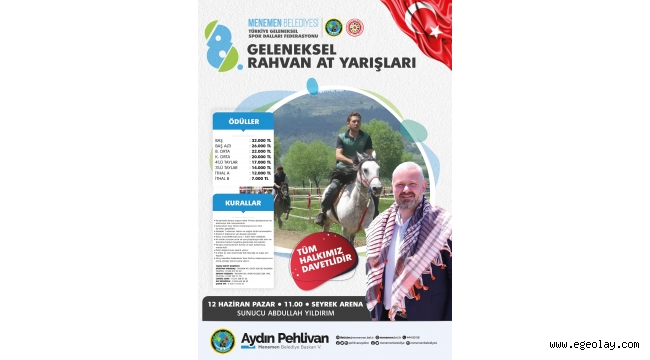 EGEOLAY/Menemen Belediyesi ev sahipliğinde Türkiye Geleneksel Spor Dalları Federasyonu’nun katkılarıyla Seyrek Arena’da 8’incisi gerçekleştirilecek olan ‘Geleneksel Rahvan At Yarışı’ için hazırlıklar tamamlandı. Belediye Başkan Vekili Aydın Pehlivan, Rahvan At Yarışlarına tüm vatandaşları davet etti.
