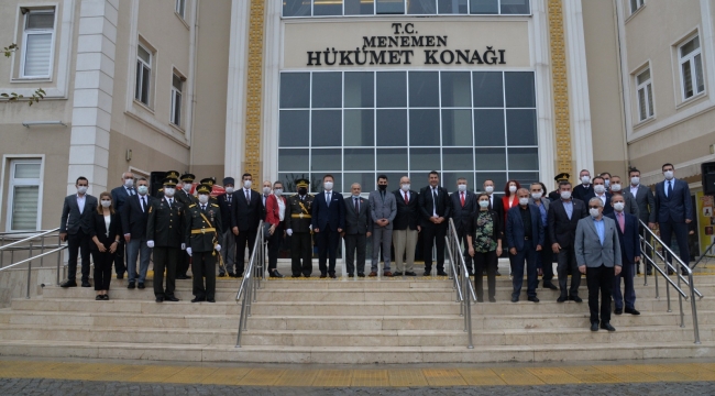 Menemen’de 28 Ekim tarihinde Cumhuriyet Meydanı’ndaki çelenk sunum töreni ile başlayan Cumhuriyet Bayramı kutlamaları 29 Ekim sabahı Menemen Hükümet Konağı önünde gerçekleşen resmi tören ile devam etti. Belediye Başkanı Serdar Aksoy’un yanı sıra Menemen Kaymakamı Fatih Yılmaz, Garnizon Komutan Vekili Topçu Albay Eray Ercan, Cumhuriyet Savcısı Uğur Gündoğdu’nun da hazır bulunduğu tören yapılan konuşmalar ve kutlamalarla son buldu.