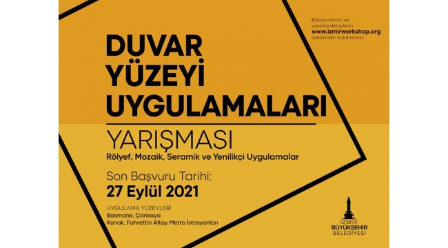 Basmane, Çankaya, Konak ve Fahrettin Altay metro istasyonlarının yolcu giriş ve çıkış akslarında 8 noktada çini,  seramik, mozaik, rölyef gibi geleneksel tekniklerin yanında yenilikçi sanatsal duvar yüzeyi uygulamaları için ulusal düzeyde açılan yarışmaya başvurular devam ediyor.  Sanatçıların birden fazla duvar için proje sunabileceği yarışmaya son başvuru tarihi 27 Eylül 2021 olarak belirlendi.