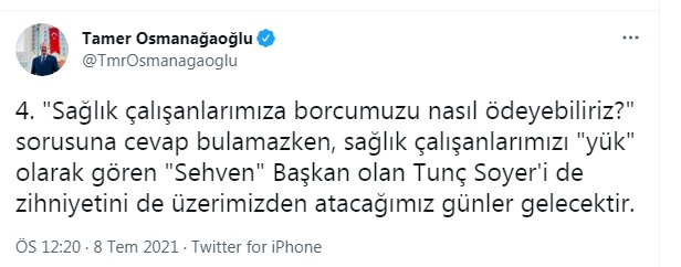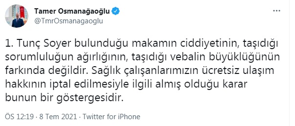 Soyer’in sağlık çalışanlarının ücretsiz ulaşım hakkını iptal eden kararından sonra sosyal medya hesabından yaptığı paylaşımlarla Tunç Soyer’e yüklenen Osmanağaoğlu “Tunç Soyer bulunduğu makamın ciddiyetinin, taşıdığı sorumluluğun ağırlığının, taşıdığı vebalin büyüklüğünün farkında değildir. Sağlık çalışanlarımızın ücretsiz ulaşım hakkının iptal edilmesiyle ilgili almış olduğu karar bunun bir göstergesidir.” ifadelerini kullandı.