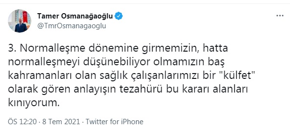 "Normalleşme dönemi" deyince aklına ilk gelen hususun "sağlık çalışanlarının ücretsiz ulaşım hakkının iptal edilmesi" olması ise kendisinin bilinçaltının ne derece çarpık gündemlerle meşgul olduğunun ispatıdır. Normalleşme dönemine girmemizin, hatta normalleşmeyi düşünebiliyor olmamızın baş kahramanları olan sağlık çalışanlarımızı bir "külfet" olarak gören anlayışın tezahürü bu kararı alanları kınıyorum.” Diyen Osmanağaoğlu “"Sağlık çalışanlarımıza borcumuzu nasıl ödeyebiliriz?" sorusuna cevap bulamazken, sağlık çalışanlarımızı "yük" olarak gören "Sehven" Başkan olan Tunç Soyer'i de zihniyetini de üzerimizden atacağımız günler gelecektir.” dedi.