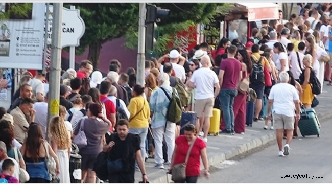 EGEOLAY/30 Ağustos Zafer Bayramı tatilini fırsat bilen Türk tatilciler, Ayvalık Deniz Hudut kapısının önünde bir kilometre kuyruk oluştu, Feribot seferlerinde büyük bir talep yaşandı.