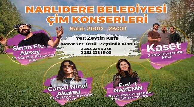 Narlıdere Belediyesi’nin bu yıl ilk kez düzenleyeceği Çim Konserleri, pazar yerinin üst kısmındaki zeytinlik alanda yeni yapılan Zeytin Kafe’nin bahçe alanında 21.00- 23.00 saatleri arasında yapılacak. İlk konser 12 Ağustos Perşembe günü gerçekleşecek ve pop müziğin sevilen ismi Sinan Efe Aksoy sahne alacak.