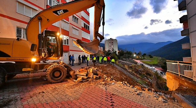 İzmir Büyükşehir Belediyesi, geçen hafta aralıksız devam eden sağanak yağışların etkisiyle Narlıdere’de çöken istinat duvarına müdahale etti. Dün (8 Aralık Çarşamba) 18.00'de Narlıdere 2. İnönü Mahallesi Özkarakaya Caddesi'ndeki Narkent Sitesi’nde yaşanan olayın ardından yurttaşların can güvenliğini sağlamak için 88 daire boşaltıldı. İzmir Büyükşehir Belediyesi Fen İşleri Dairesi Başkanlığı’na bağlı ekipler de alandaki güvenliği sağlamak için seferber oldu.