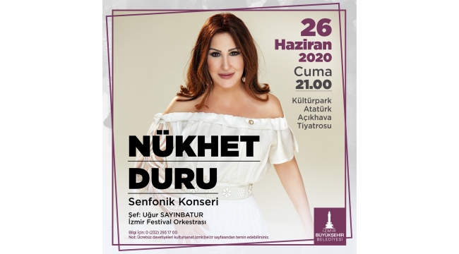 İzmir Büyükşehir Belediyesi Nükhet Duru’yu ağırlıyor. Duru 26 Haziran Cuma akşamı saat 21.00’de Kültürpark Açıkhava Tiyatrosu’nda sevenleriyle buluşacak. Konserde oturma düzeni fiziksel mesafe gözetilerek sağlanacak. Salgın önlemleri nedeniyle konseri bin kişi izleyebilecek.