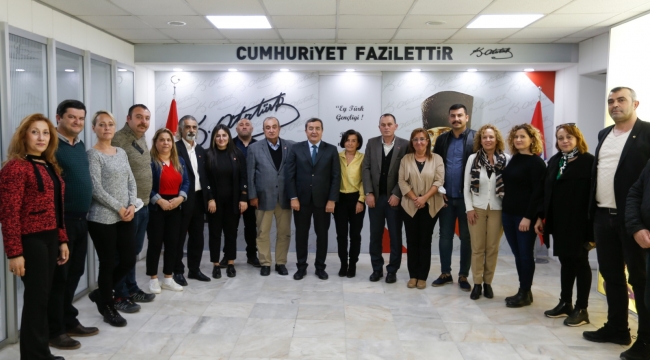 EGEOLAY/CHP Konak İlçe Başkanlığı görevine getirilen Akın Küçükoğullarından ve Yönetim Kurulu Üyeleri, Konak Belediye Başkanı Abdül Batur’u, makamında ziyaret ederek birliktelik mesajı verdi. Yeni ilçe başkanı ve yönetim kurulu üyeleri, Başkan Batur’a doğum günü sürprizi de yaparak birlikte pasta kesti.