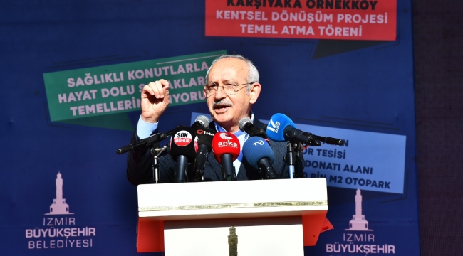 EGEOLAY/İzmir Büyükşehir Belediyesi'nin Örnekköy'de devam eden kentsel dönüşüm çalışmalarının ikinci etabının temeli CHP Genel Başkanı Kemal Kılıçdaroğlu'nun katıldığı törenle atıldı. Törende konuşan Kılıçdaroğlu, “Burada kentsel dönüşümden daire sahibi olanların başka bölgelere sürüldüğünü görmeyeceksiniz. Oradaki ranttan o insanların yararlandığını göreceksiniz. Bu süreçte güvenceyi sağlayan belediyeyi göreceksiniz” dedi.