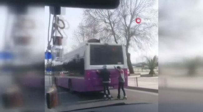 Maltepe'de patenli iki genç, otobüsün arkasına takılarak uzun süre yolculuk etti. Trafik güvenliğini hiçe sayan gençler cep telefonu kamerasınca kaydedildi.
