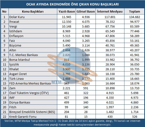 Türk Lirası Ocak ayında dünyada dolar karşısında yüzde 2 değer kazanarak, dolar ve euro karşısında en çok değer kazanan para birimi oldu. Yılın ilk işlem gününe 7,43 TL seviyesinde başlayan dolar kurunda, T.C Merkez Bankası tarafından 2020 yılının son faiz kararında politika faizinde artışa gidilmesinin ardından önemli gelişmeler yaşandı. Merkez bankasının attığı adımlardan sonra döviz kurlarındaki düşüş eğilimi sürerek, dolar 7,30 TL seviyelerini gördü. Ay boyunca yaşanan gelişmelerle ufak dalgalanmalar yaşayan dolar kuru, genel olarak aşağı yönlü ivmeyi seyrederek, ayın son işlem gününü 7,37 TL seviyesinde kapattı.  Yılın ilk ayında Türk Lirası karşısında yüzde 1,56 değer kaybeden dolar kuru, ay boyunca toplam 134 bin 682 haberle Ocak ayında en çok konuşulan ekonomi başlığı olurken, T.C. Merkez bankası ise yeni politikaları ve yaptığı hamleler ile medyada 41 bin 941 haberde yer aldı.