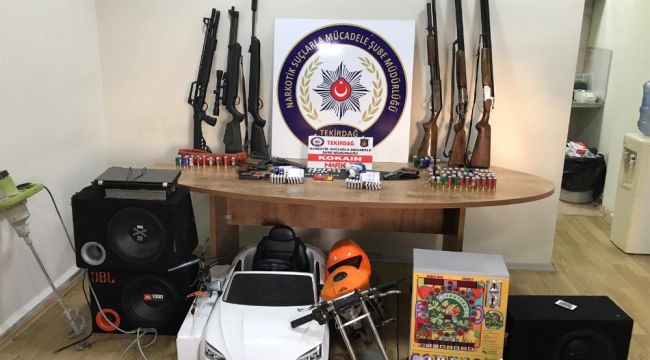 Tekirdağ İl Emniyet Müdürlüğü Narkotik Suçlarla Mücadele Şube Müdürlüğü koordinesinde Tekirdağ KOM Şube Müdürlüğü görevlileri ile Çorlu İlçe Emniyet Müdürlüğü ekiplerince Çorlu'da Hıdırağa Mahallesi'nde yer alan 6 ikamet ile bir iş yerinde alınan arama kararına istinaden arama yapıldı. Yapılan aramalar neticesinde satışa hazır halde toplam 30 fişek kokain, 200'ü aşkın uyuşturucu nitelikli hap, satışa hazır halde fişeklenmiş olarak bonzai olarak da bilinen sentetik kannabinoid, 5 adet av tüfeği, 2 adet tabanca, av tüfeği ve tabancalara ait mermiler, elektronik kumar makinesi ve çeşitli malzemeler ele geçirildi.