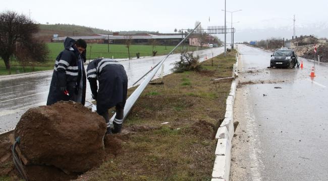 Elazığ'da yağış nedeniyle sürücüsünün direksiyon hakimiyetini kaybettiği hafif ticari araç öne refüje, sonra direğe çarptı. Direğin yerinden söküldüğü kazada araçta bulunan 3 kişi yaralandı.
