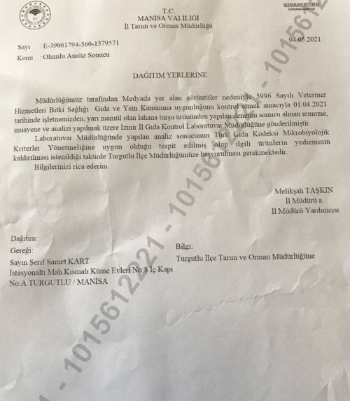 Manisa'nın Turgulutlu ilçesinde faaliyet gösteren Şah Tarım Ürünleri fabrikası geçtiğimiz aylarda bir çalışan tarafından yayımlanan sosyal medya videosu yüzünden mührlenmişti. Manisa İl Tarım Müdürlüğü ve Turgutlu İlçe Tarım Müdürlüğü ekipleri tarafından fabrikadan alınan ve incelemeye gönderilen numunelerin sonuçları temiz çıktı. Raporda, 'yapılan analiz sonucunda Türk Gıda Kodeksi Mikrobiyolojik kriterler yönetmeliğine ugun olduğu tespit edildi' açıklaması yer aldı.