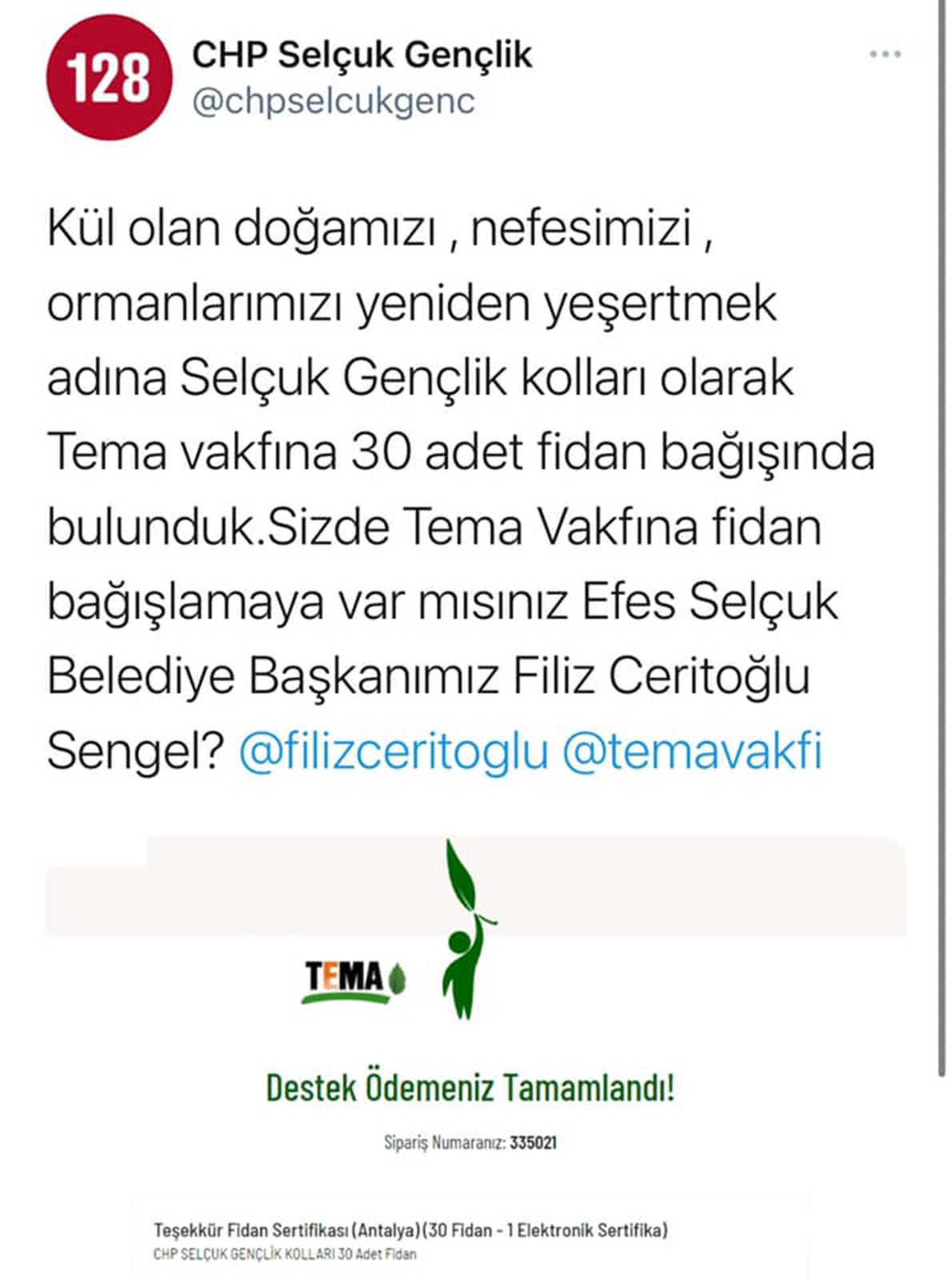 Kısa sürede hızla büyüyen kampanyanın çağrısı üzerine kızı Nefes adına 100 fidan bağışı yapan Efes Selçuk Belediye Başkanı Filiz Ceritoğlu Sengel, "#ŞahinAkdemir ve tüm yitip giden canlara. Gelecek, gençlerin; bize düşen, geleceğe nefes olmak" diyerek, bu kampanyaya CHP İlçe Başkanı Mehmet Karanfil, CHP İzmir İl Başkan Yardımcısı İpek Onbaşıoğlu, CHP İlçe Yönetim Kurulu Üyeleri ve Belediye Meclis Üyelerini davet etti. Cumhuriyet Halk Partisi (CHP) Selçuk Gençlik Kollarının başlattığı fidan bağışı kampanya zinciri giderek büyüyor.