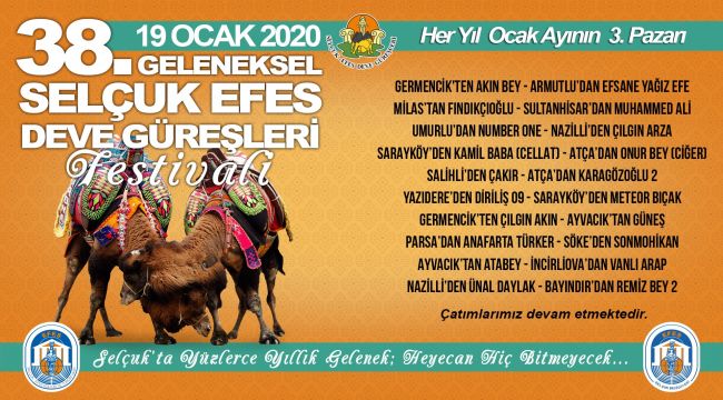 İzmir’de en büyük Deve güreşleri organizasyonun başında Selçuk ilçesi geliyor. Çünkü her yıl ilçede geleneksel olarak Deve güreşleri ciddi paralar harcanarak kapsamlı bir şekilde yapılıyor.