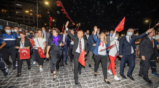 EGEOLAY/İzmir'in kurtuluşunun 99’uncu yıl dönümü, tüm gün süren etkinliklerle kutlandı. Geceye taşan 9 Eylül coşkusu, Cumhuriyet Meydanı'ndan Gündoğdu Meydanı'na kadar süren Fener Alayı ile doruğa ulaştı. Athena konseriyle coşan İzmirlileri eşi Neptün Soyer ile “Güzel İzmir, Güzel İzmir'in güzel insanları” diyerek selamlayan Başkan Tunç Soyer, “İzmir'in dağlarında çiçekler açıyor. Her biriniz o çiçeksiniz, sizler İzmir'in çiçeklerisiniz. Umudumuz sizsiniz, umudumuz büyük. Biliyorum ki Türkiye'nin her yerinde çiçekler açtıracaksınız” dedi.