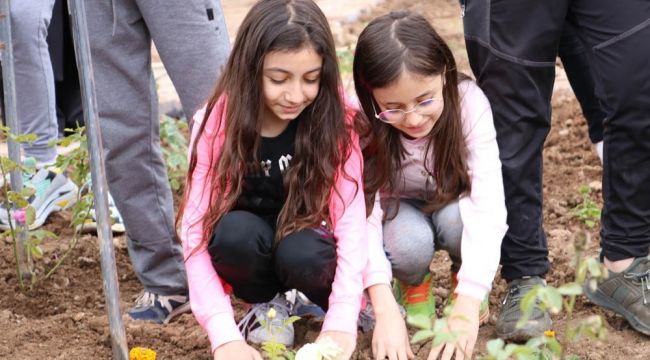 Sivas'ta okul bahçesine kurulan hobi bahçesinde çocuklar çiçek ve sebze yetiştirerek toprağı tanıyorlar.