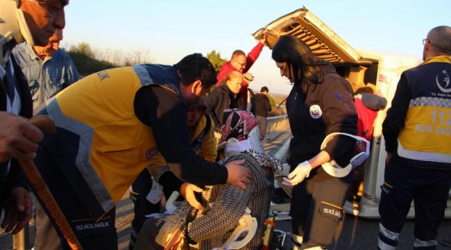 Düzce'de TEM otoyolunda lastiği patlayan minibüsün devrilmesi sonucu meydana gelen kazada 17 kişi yaralandı.