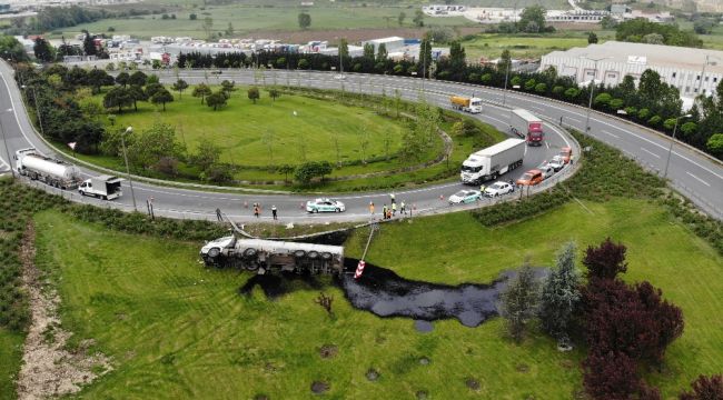 TEM Otoyolu Çatalca Gişeler mevkiinde virajı alamayarak devrilen tankerin içindeki zift yeşil alanı kapladı. Kazada sürücü yara almadan kurtulurken, devrilen tanker havadan da görüntülendi.