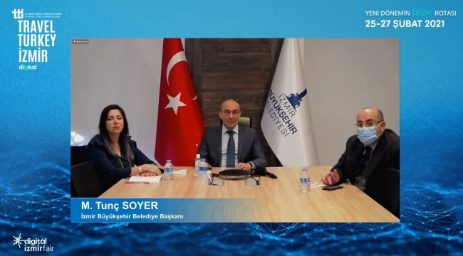 İzmir Büyükşehir Belediye Başkanı Tunç Soyer, İzmir’i fuarlar kenti yapma hedefi doğrultusunda büyük bir özveri ile çalışıldığını belirterek, pandemi nedeniyle gerçekleşemeyen fuarların sanal fuarlara dönüşmesinin sektör adına önemli bir avantaj olduğuna değindi. Başkan Soyer, “Dijital bir platform olması yönüyle fuarımız; pandemi sonrası en büyük zararı gören sektörlerden biri olan turizm sektörünü canlandıracak ve ülkemizde, bundan sonra gerçekleştirilecek sektör fuarları açısından yepyeni bir bakış açısı sunacak. Biz, pek çok kültürel ve coğrafi değeri ile özel bir şehir olan İzmir’in dünya ölçeğinde bir çekim merkezi olması için çalışıyoruz. Pandemi sonrası açığa & ccedil;ıkan fırsatları doğru değerlendirebilmek için gereken tüm çalışmaları paydaşlarımız ile yürütüyoruz. Pandemi sürecinde, Turizm Hijyen Kurulu’nu kurduk ve “Turuncu Çember” uygulamasını başlatarak İzmir’i güvenilir ve sağlıklı bir destinasyon olarak konumlandırdığımız iletişim kampanyamız ile pandeminin yarattığı tüm olumsuzluklara rağmen İzmir’de turizm sektörünü, beklentilerin üzerinde kapatmayı başardık. İzmir Vakfı’nın koordinasyonu, Büyükşehir Belediyemiz ile İzmir Kalkınma Ajansı’nın ortaklığıyla Türkiye’nin ilk dijital turizm ansiklopedisine sahip olduk. 40’tan fazla uzmanın çalışmasıyla İzmir’in dijital destinasyon envanterini hazırladık. Tarih ve kültür, gastronomi, somut olmayan kültürel miras, etkinlik ve festivaller, inanç, endüstriyel miras, deniz ve kıyı, doğa ve kırsal alanlar , sinema, sağlık ve konaklama gibi 11 farklı başlıkta, iki binden fazla noktaya dair bilgi ve görsel bir araya getirildi” şeklinde konuştu.