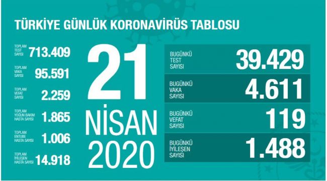 Tabloya göre, toplam test sayısı 713 bin 409, toplam vaka sayısı 95 bin 591, toplam vefat sayısı 2 bin 259, toplam yoğun bakım hasta sayısı 1865, toplam solunum cihazına bağlı hasta sayısı 1006, toplam iyileşen hasta sayısı 14 bin 918 oldu.