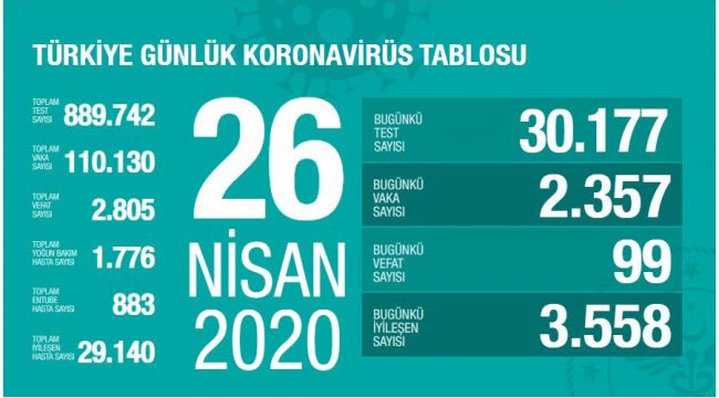 EGEOLAY/Sağlık Bakanlığı'ndan yapılan açıklamada, "Son 24 saatte 2 bin 357 kişiye Covid-19 tanısı konuldu, 99 kişi hayatını kaybetti, toplam vaka sayısı 110 bin 130, can kaybı 2 bin 805 oldu" denildi.
