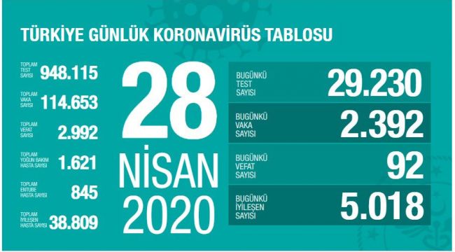 Türkiye'de 24 saatte 92 kişi daha Covid-19 nedeniyle hayatını kaybetti. Toplam can kaybı 2 bin 992'ye yükseldi. Vaka sayısı da 2 bin 392 artarak 114 bin 653 oldu. İyileşen sayısı da 5 bin 18 artarak 38 bin 809'a çıktı.