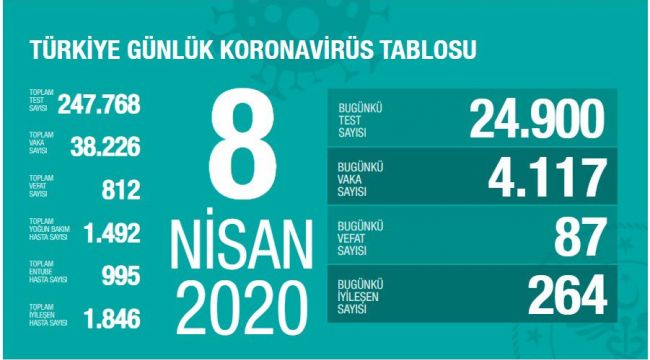 EGEOLAY/Yeni tip koronavirüs nedeniyle hayatını kaybedenlerin sayısı 812'ye yükseldi. 24 bin 900 test yapılırken, 4 bin 117 tanı konuldu. Toplam vaka sayısı ise 38 bin 226 oldu.