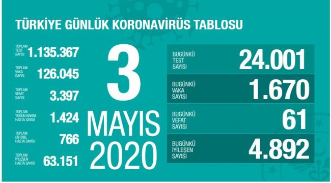 Türkiye'de son 24 saatte 1.670 yeni vaka tespit edildi, 61 kişi daha hayatını kaybetti. İyileşenlerin sayısı ise 4.892 artarak 63 bin 151'e yükseldi.