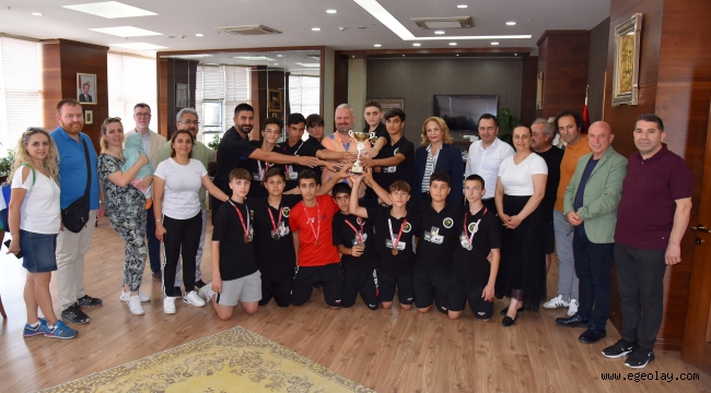 Öğrencileri makamında ağırlayan ve Rahvan At Yarışları Programı dolayısıyla Mardin’deki şampiyonluk maçında bulunamadığını ifade eden Pehlivan, “Sevgili gençler, Okul Sporları Yıldız Erkekler Futsal Türkiye Şampiyonası’nda göstermiş olduğunuz başarıdan dolayı sizleri canı gönülden kutluyorum. Tek bir yenilgi almadan aşama aşama şampiyonluğa koşmak, neticesini de şampiyonluk kupasıyla taçlandırmak çok önemli bir başarı. Öğretmenlerimizi, idarecilerimizi de ayrıca tebrik ediyorum. Bizlere çok özel bir gurur yaşattınız. Kazandığınız kupa okulumuzda nesillerden nesillere aktarılacak. Yolunuzu açmak için Menemen Belediyesi olarak biz her zaman yanınızda olacağız. Başarılarınız daim olsun. İyi ki varsınız” dedi.